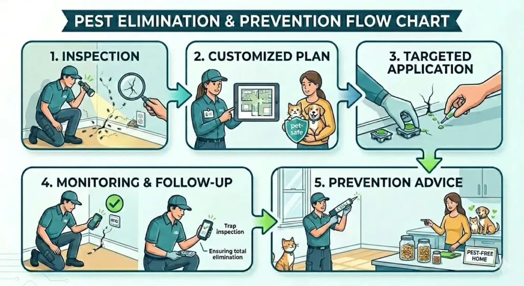 Pet-friendly pest control follows a structured approach designed to minimize risk and maximize effectiveness.